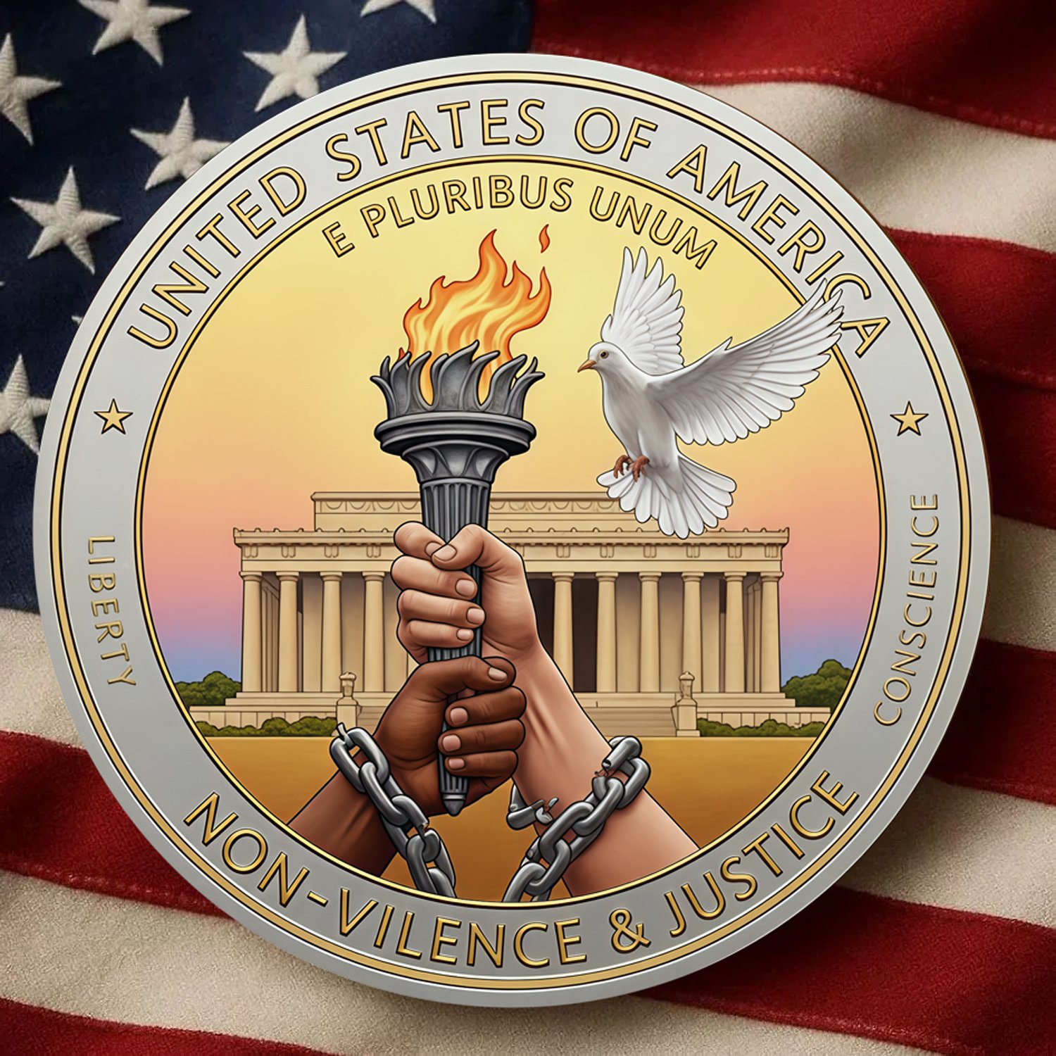 The back of the coin depicts hands—united across backgrounds—lifting a burning torch of justice. Broken chains represent liberation from oppression, while a soaring white dove symbolizes peace, hope, and the promise of a better tomorrow. The Lincoln Memorial stands proudly behind them, grounding the scene in American history.
